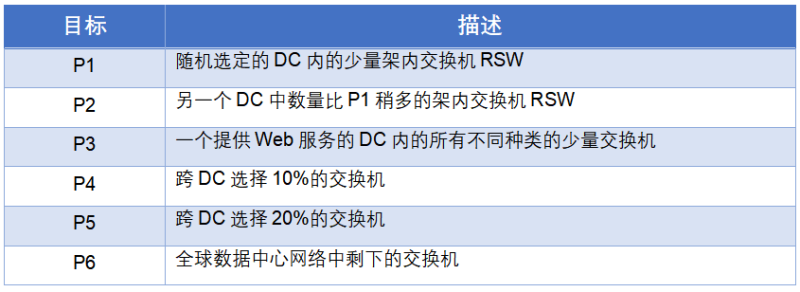 Facebook定义了6个不同的部署推送阶段,参见下表:P1 ~ P6 ,在升级过程中依次执行。在每一个阶段,推送引擎会根据该阶段的规则随机选择一定数量的交换机,然后推送引擎将推送并重启这些交换机上的BGP。这6个推送阶段是逐步扩大部署范围的过程,最后一个阶段推送到所有的交换机上。