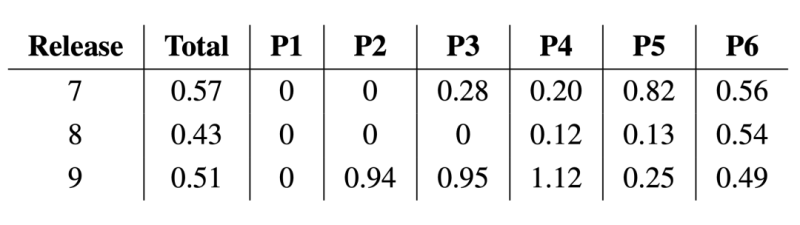 无法推测各种不可达设备何时恢复,当然也不期望由于少量的失败而停止推送步骤,因此对于每个阶段设置了99%的阈值,只要失败的数量不大于1%那么就可以继续进行。下面的表格中显示了12个月周期中最后三次推送的各个阶段的失败百分比,最差的一次(第7次)总体成功率也在99.43%。