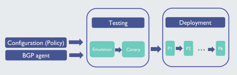 在成功的完成仿真测试以后,下一步将在生产网络中进行灰度测试。新的BGP Agent软件或者新版本的配置会运行在生产网络中少量的叫做“Cannaris”交换机上。灰度测试可以使得有机会进一步的捕获之前没有发现的问题,同时增加上线的信心。通过挑选在生产网络中的交换机,可以捕获一些因为规模导致的问题,例如:交换机的收敛变慢。