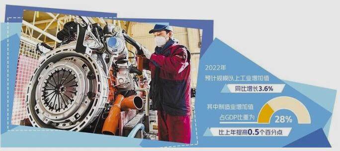 在日前召开的全国工业和信息化工作会议上,工业和信息化部党组书记、部长金壮龙表示,2022年,工业经济总体回稳向好。预计全年规模以上工业增加值同比增长3.6%,其中制造业增加值增长3.1%左右;制造业增加值占GDP比重为28%,比上年提高0.5个百分点。