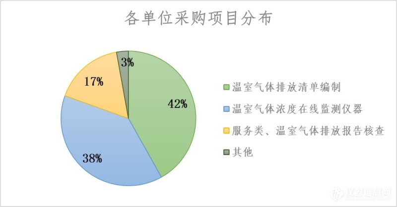 统计可知,2022年下半年,各单位采购项目以以下三项为主:1)温室气体排放清单编制,占比42%;2)温室气体浓度在线监测设备、温室气体浓度分析仪等仪器类,占比38%;3)服务类、温室气体排放报告核查,占比17%。