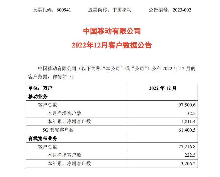 C114讯 1月28日消息(九九)中国移动日前公布2022年12月份运营数据,当月,中国移动移动客户数净增32.5万户,2022全年累计净增1811.4万户,用户总数达到9.75006亿户。