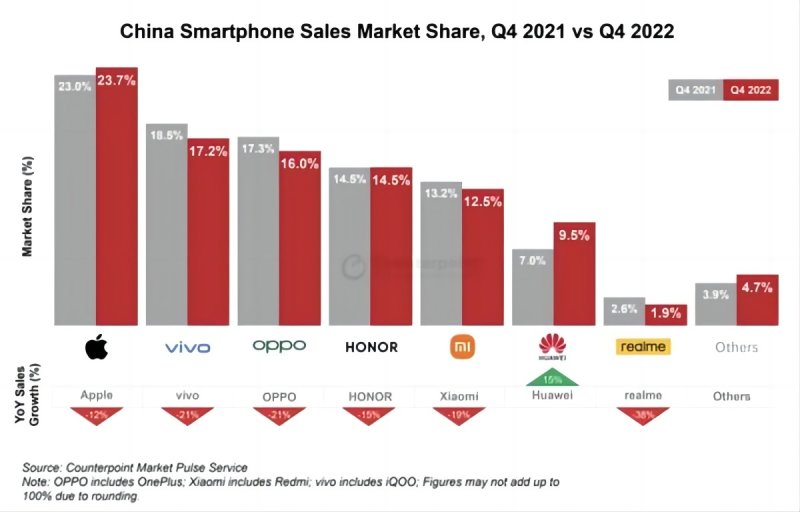 Counterpoint 指出,受中国市场智能手机销售放缓影响,在 2022 全年,除华为外,苹果、vivo、OPPO、小米等手机品牌均有不同程度销量下滑,但苹果的降幅明显小于其余品牌。