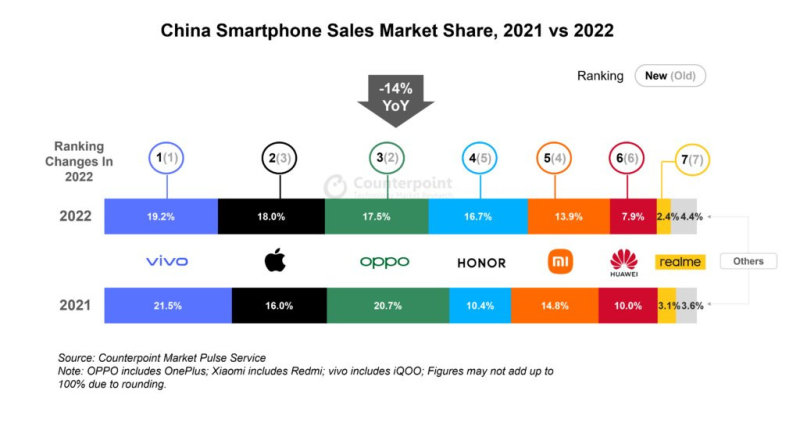 IT之家 1 月 28 日消息,Counterpoint Research 数据显示,中国智能手机销量 2022 年同比下降 14%,其中第四季度下降 15%。