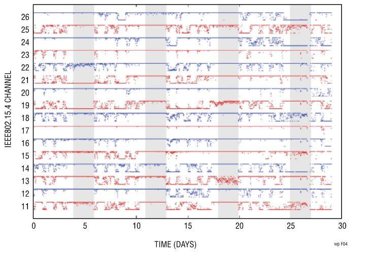 由于环境中的对象不是静态的,例如,汽车驶过,门被打开和关闭,因此多路径的影响会随着时间的推移而变化。图4显示了26天内两个工业传感器之间单个无线路径上的数据包传输率,以及系统使用的16个通道中每个通道的数据包传输率。每周都有工作日和周末清晰可见的周期。在任何给定时间,有些渠道是好的(高交付),有些是坏的,还有一些是高度变化的。渠道 17 虽然总体上不错,但至少有一个零交付期。网络中的每个路径都表现出质相似的行为,但具有不同的信道性能,并且网络中从来没有任何一个信道是好的。1