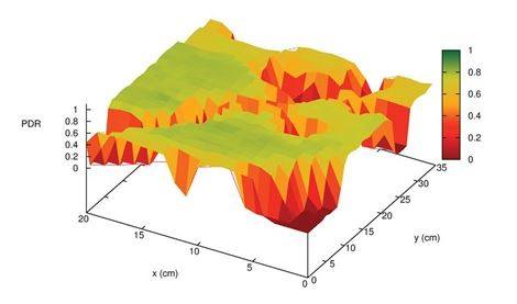 图3是通过将发射器向5m外的接收器发送1000个数据包,并在接收器位于35cm×20cm网格中的每个点上重复此操作而获得的。z 轴表示该链路上的数据包传递比率。虽然链路在大多数位置都很好,但在某些位置,由于多路径衰落,没有成功接收数据包。