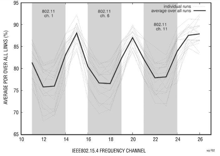 图 2 是通过在办公环境中部署 45 个 802.15.4 节点并让它们交换 1200 万个数据包,平均分布在 16 个 802.15.4 通道上得到的。它将这些数据包的平均数据包传输比率绘制为它们传输的通道的函数;在与 Wi-Fi 信道重叠的信道上,此交付比率较低。