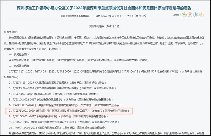 喜讯!由深圳市停车行业协会牵头、捷顺科技主编的团体标准T/SZPIA 001—2020《停车库(场)管理系统预约停车数据接口规范》成功获评深圳市重点领域优秀团体标准,充分体现了捷顺科技在行业标准技术领域的用心程度和专业能力。