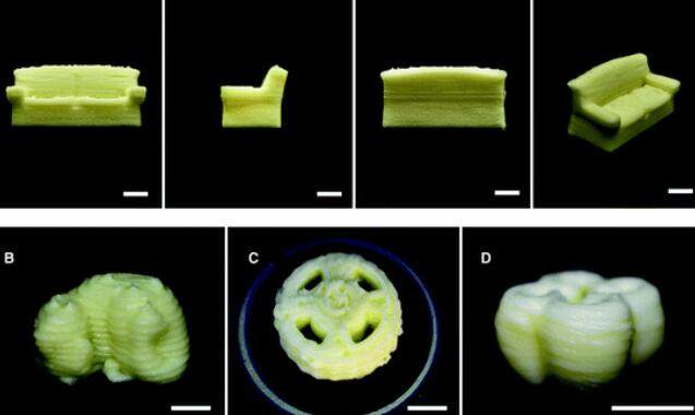 该团队在《RSC Advances》上发表了一项关于牛奶“墨水”配方的研究,其中包括将奶粉与水明智地混合,以获得合适的浓度,从而在较低的温度下制造3D物体。研究人员通过成功打印一个小沙发、一片三叶草叶子、一个堡垒、一个圆锥体和一个轮子来测试它。