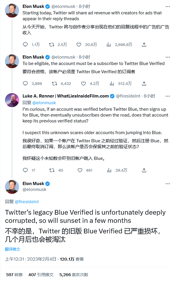 马斯克在本周五的推文中表示:“Twitter 将于今天开始,向创作者分享嵌入其推文评论中的广告收益”。