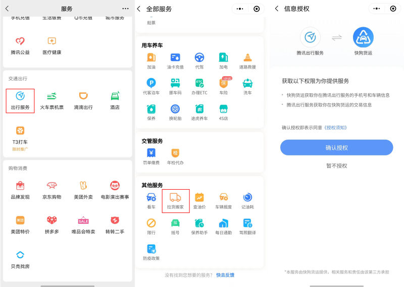 在其中,出行板块又是腾讯近年来重点的布局对象,目前腾讯出行服务平台已经能够提供打车、加油充电、油卡充值、代驾、租车、公交地铁、火车汽车票、船票、停车缴费、违章查缴、洗车保养等多种出行服务。2月3日,著名同城货运平台快狗打车以“首家入驻”这样的标签高调官宣加入到微信出行服务板块中,壮大了腾讯出行服务的覆盖面,也算是填补了微信出行服务在同城货运领域的空白。