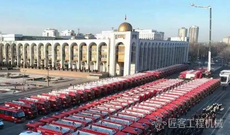 交接仪式当天,在吉尔吉斯斯坦首都比什凯克市中心阿拉套广场上,100辆带有“中国援助”和徐工标识的重型消防车整齐列阵,汇聚成一片红色“海洋”。