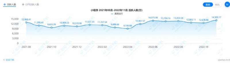其中一部分原因在于滴滴出行小程序承接了不少滴滴出行APP的流量和订单;根据易观千帆数据显示,滴滴出行小程序的活跃人数从2021年8月的1.2968亿增长到2022年10月的1.4309亿,尤其是自6月起,活跃人数相对稳定。