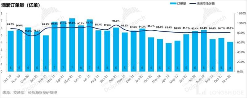 相对应地,我们看到,滴滴2022年每月的订单量整体出现了下滑,1月-4月,下滑最快,5月-8月的订单量虽然逐步回升,可是很快便回落。滴滴依赖的是订单抽佣,其去年的业绩可想而知,因此,急于上市的它估计又将面临一份难看的财报。