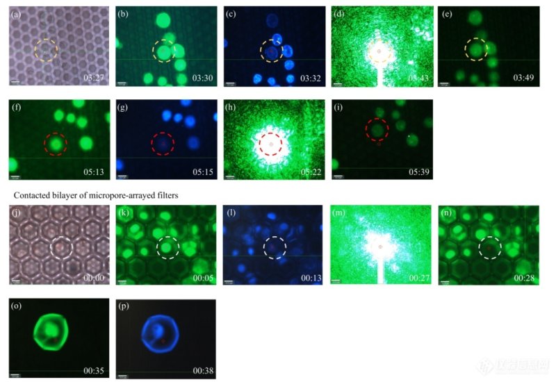 图 3:用于单细胞拾取的微孔 LIFT平台的动态过程。(a-i)基于单层微孔阵列过滤器的单细胞拾取:目标细胞拾取失败,细胞在开始时没有移动(a-e),而细胞在一段时间后产生小位移(f-i),由于液层随着时间的推移而减少。(j-p)基于接触双层微孔阵列过滤器的单细胞拾取:由于上部微孔阵列可以切割捕获细胞的液体层,因此实现了目标细胞拾取。拾取的单个细胞由细胞接收器(o-p)接收。细胞用细胞追踪器绿色和Hoechst预染。
