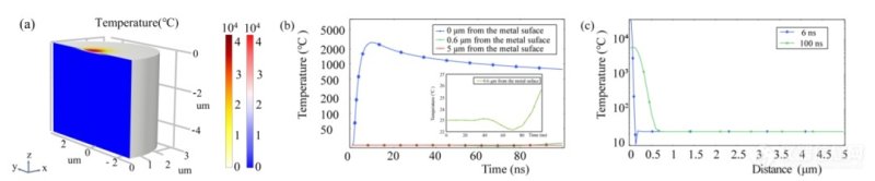 图 2:细胞分选过程的有限元分析。分拣过程中的温度场模型(a)和分拣过程中不同位置的温度场随时间变化(b)。激光烧蚀金属膜的最高温度小于2700°C,而距离金属层0.6 μm的液体在100 ns内保持在27°C以下。(c)