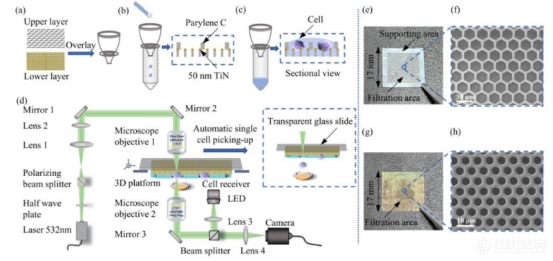 图1:微滤-激光诱导前向转移(微滤-LIFT)组合平台的示意图(a-d):(a)双层微孔阵列器件封装,(b-c)基于尺寸的细胞分离和富集,(d)单细胞的识别和拾取。L1 至 L4,镜片; HP,半波片; PBS,偏振分束器;M1到 M3,镜子; DM,二向色镜; EF,发射滤光片; MO1至MO2,显微镜物镜。上部(e-f)和下部(g-h)滤膜的照片和SEM图像
