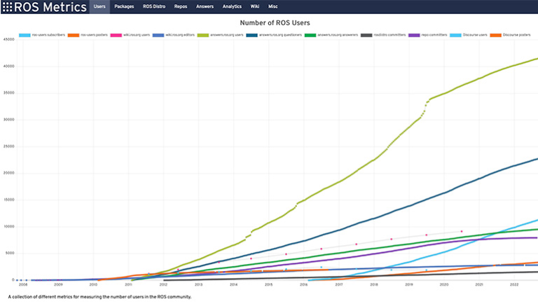 对于社区支持,似乎有更多用户转向 ROS Discourse 资源,因为 Discourse 用户自 2021 年以来增长了 +9.8%,而 ROS Answers 用户下降了 -11.19%。