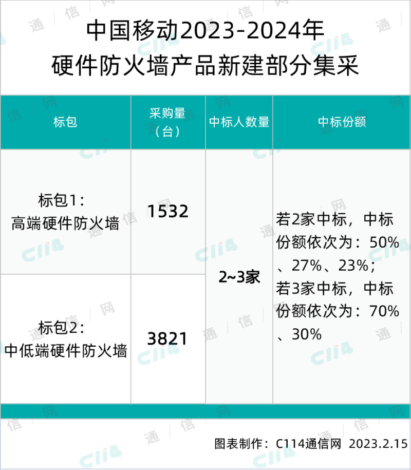 C114讯 2月15日消息(焦焦)从中国移动官网获悉,中国移动日前发布招标公告称,启动2023年至2024年硬件防火墙产品新建部分集采。