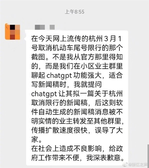 据了解,昨天下午杭州某小区业主群里讨论Chatgpt,一位业主就开玩笑说尝试用它写篇杭州不限行的新闻稿看看,随后该业主在群里直播了chatgpt写作过程,还把生成的文章发群里,此事被其他业主不明所以截图转发,最后导致错误信息被传播。