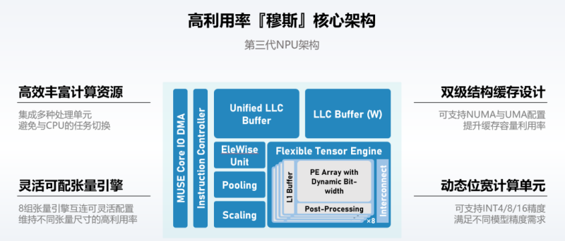 不同 NPU 核心既可独立运行,也可联合运行加速同一任务,使用灵活方便。在设计阶段编译、架构深度耦合,且深入考虑到由于多芯粒互联带来的约束和代价,经优化后,芯片资源利用率号称平均可达 70%。
