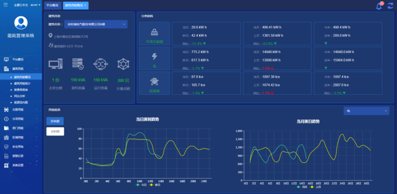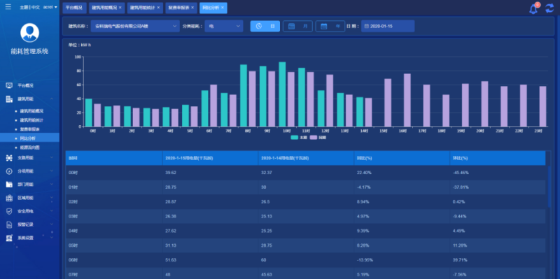 对建筑、部门、区域、支路、分类分项等用能进行对比,支持当日逐时趋势、当月逐日趋势曲线、分时段能耗统计对比、总能耗同环比对比。