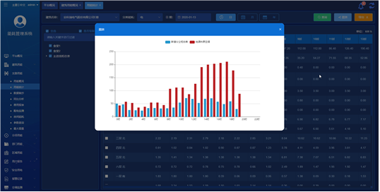 对建筑、区域、分项、支路等结构按日、月、年报表的形式统计对分类能源用能进行统计,支持报表数据导出EXCEL,支持选择建筑数据进行生成柱状图。