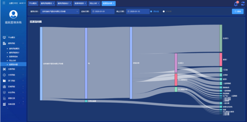 能源流向图展示单栋建筑指定时段内各类能源从源头到末端的的能源流向,支持按原始值和折标值查看。