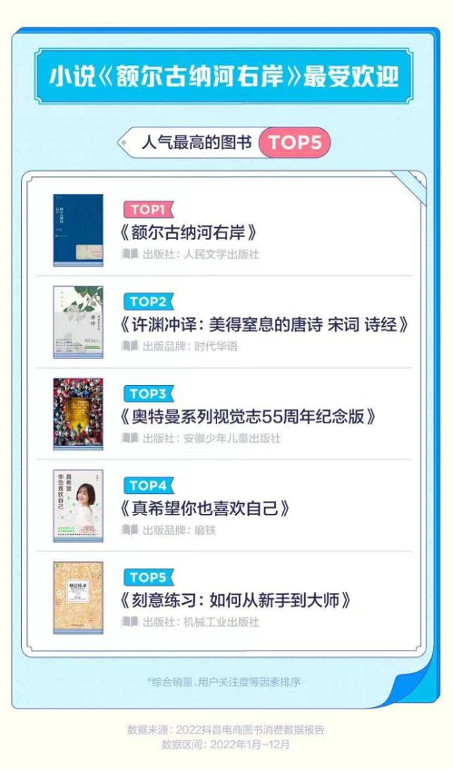 这份报告还显示,过去一年,抖音电商卖出了2.5亿单图书。在人气最高的五本图书中,《额尔古纳河右岸》,《许渊冲译:美得窒息得唐诗宋词诗经》以及《刻意练习》能够上榜,有赖东方甄选的推荐。