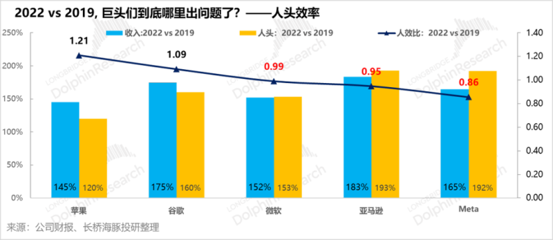 放一组数据来观察一下:在这波周期当中,招人过度,人头增速超过收入增速的依然是亚马逊和Meta,微软依然居中,苹果和谷歌表现更好一些。
