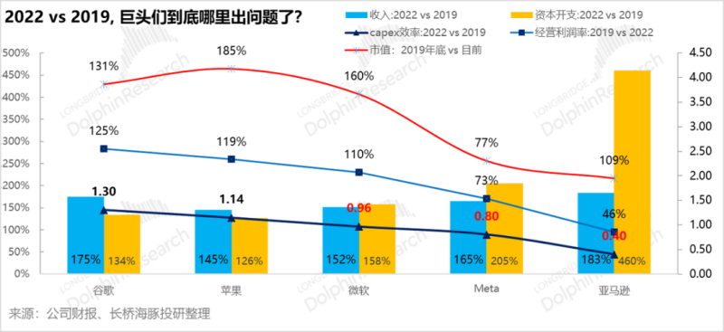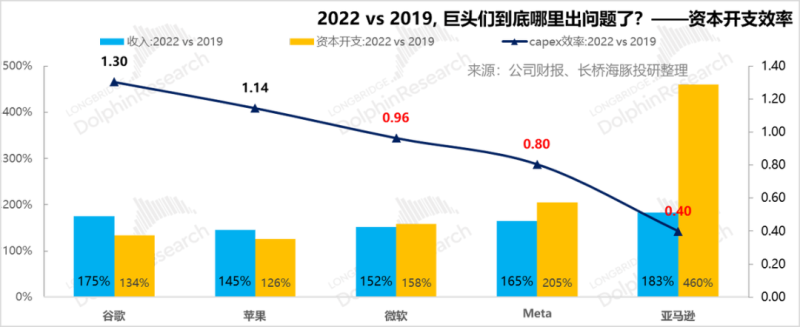 经过一轮猛投之后,到2022年底真正资本开支效率(资本开支的创收能力)有提高的,只有谷歌和苹果。