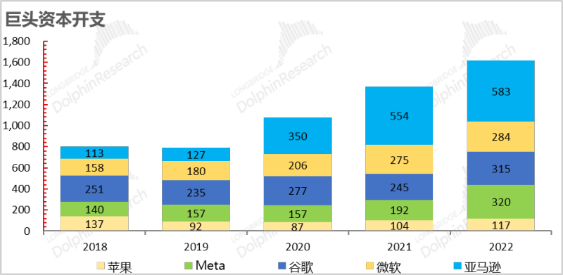 这波五大疫情红利巨头中,小扎一句“All in 元宇宙”让Meta的资本开支从2019年到2022直接三年翻番,一贯于提前两年预先投资基础设施的亚马逊,灵魂人物贝佐斯在退休前面临疫情暴涨的物流和配送需求拍下激进的资本开支计划,导致2022年底,亚马逊的资本开支整整是2019年的4.6倍。