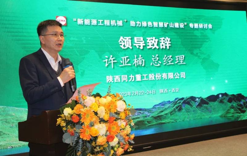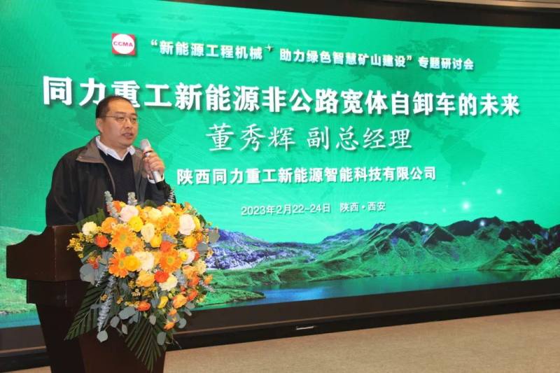 作为本次会议的协办方,陕西同力重工股份有限公司总经理许亚楠在会上发言。他指出非公路宽体车产品成为工程机械行业的一个新机种,时至今日,行业保有量已达10万余台,非公路宽体自卸车成为矿山行业的主要运输设备,也广泛应用了新能源技术。纯电动宽体车产品已在露天煤矿、金属矿山、砂石矿山、水泥矿山、封闭场地工况实现应用,纯电非公路宽体自卸车产品还出口到海外市场。