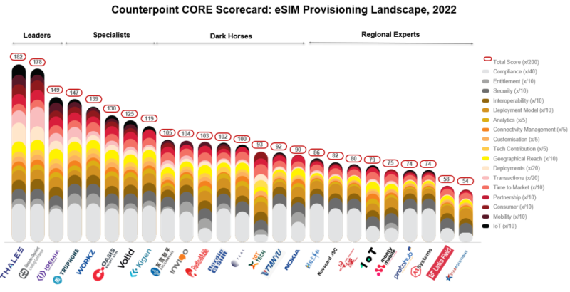 C114讯 2月24日消息(颜翊)根据Counterpoint Research最新发布的2022年版eSIM CORE(竞争、排名和评估)报告,G+D、Thales和IDEMIA成为全球eSIM供应领域的领导者,保持了他们在前一年的地位。