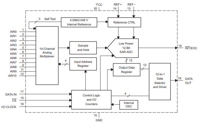 TLV2556 器件是一款 12 位开关电容器逐次逼近型模数转换器 (ADC)。ADC 具有三个控制输入:片选 ( CS )、输入输出时钟以及地址和控制输入 (DATAIN)。这些输入通过串行三态输出与主机处理器或外围设备的串行端口通信。