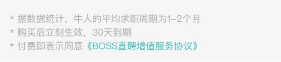 为了找到工作,康康后期还购买了 BOSS 直聘的 VIP 会员。对于当初购买会员,康康表示,是被 App 主要是因为购买页面上标出的数据吸引 ——“牛人的平均求职周期为 1-2 个月”。