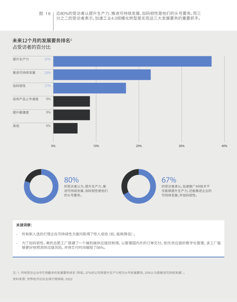 毋庸置疑,全球灯塔网络的第一章书写得遒劲有力。在灯塔先例的指引下,成员又将如何续写新篇章?为了进一步探索,我们对全球多家制造企业(包括灯塔及其他企业)展开了调研,深度洞悉其发展要务和经验方法。调研结果及后续数据分析为我们提供了宝贵洞见。