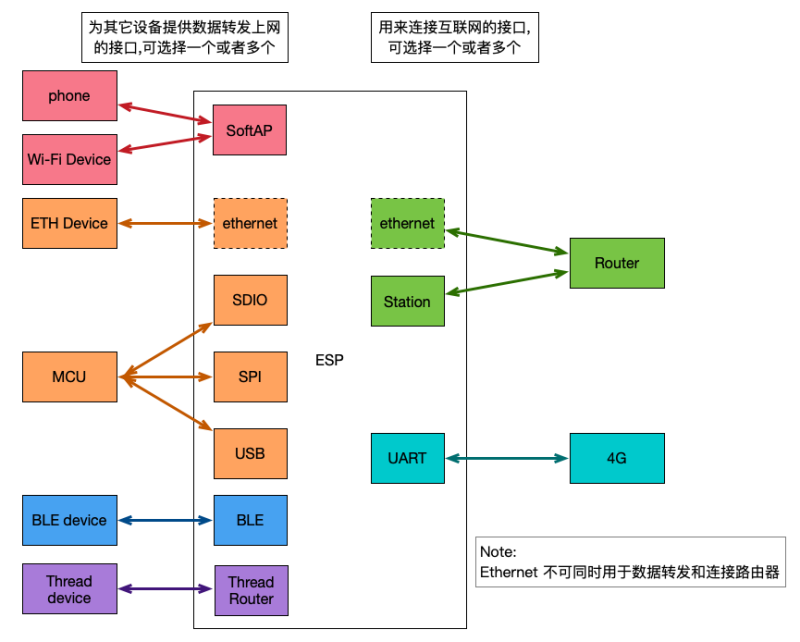 你可以通过多种不同的网络接口组合来实现个性化的智能桥接方案,最大程度地发挥乐鑫芯片的网络优势。