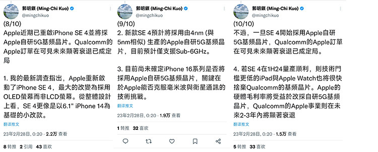 郭明錤表示,iPhone SE 4手机的外型会是类似于6.1英寸的iPhone 14小改款,采用刘海屏设计的同时使用OLED屏幕,另外这部手机可能会首发苹果自研的5G基带,这颗自研的5G基带采用4nm制程工艺,并且可能仅支持Sub-6GHz而不兼容毫米波。同时他还认为iPhone SE 4手机如果能够顺利量产的话,后续iPad和Apple Watch产品也将会逐步弃用高通的基带,后续在苹果的各类产品中全面普及苹果的自研5G基带。
