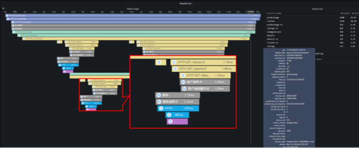 4. 通过应用调用链可视化追踪功能,实现对任意一次云原生应用请求从业务代码到框架代码、应用进程、代理进程、容器网络、云网络、NFV网元、物理网络的全链路追踪、指标观测、日志分析能力;