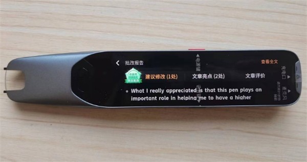 孩子日常写作时,写完之后不能得到及时批改,老师也不能针对每一个人进行指导,词汇、短语和句型的用法以及表达方式不能被及时的修订。阿尔法蛋AI词典笔T20特别设置的作文检查功能,就可以让孩子自己检查作文。只要字体不是太潦草,用T20把整篇文章扫进去,“AI老师”通过中高考作文评分同源技术就可以给出建议修改内容,指出错误,还可以显示亮点内容,让孩子加强亮点输出,最后还会像老师批改一样给出文章的整体评价。