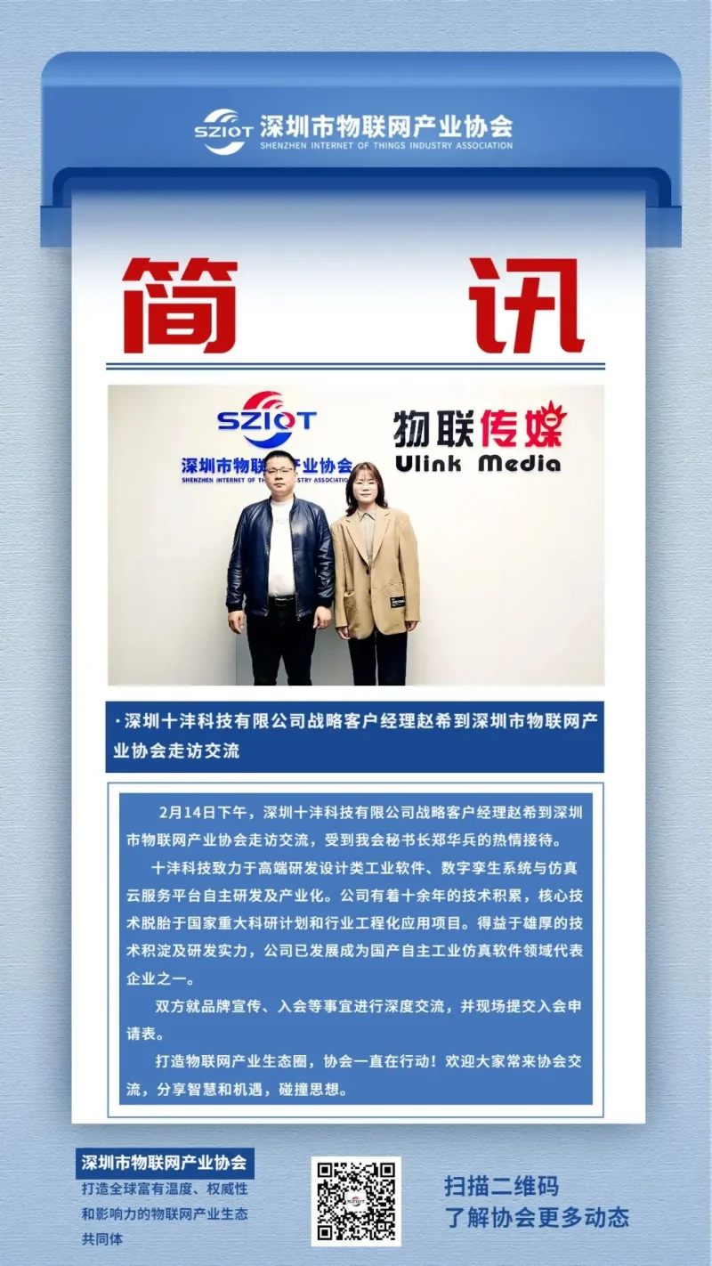 2月14日下午,深圳十沣科技有限公司战略客户经理赵希到深圳市物联网产业协会走访交流。