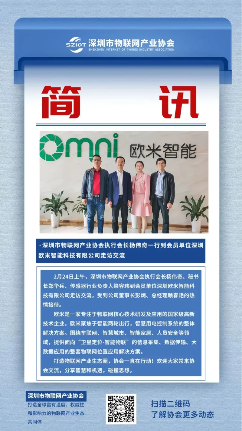 2月24日上午,深圳市物联网产业协会执行会长杨伟奇一行到会员单位深圳欧米智能科技有限公司走访交流,受到公司董事长彭炯、总经理赖春艳的热情接待。