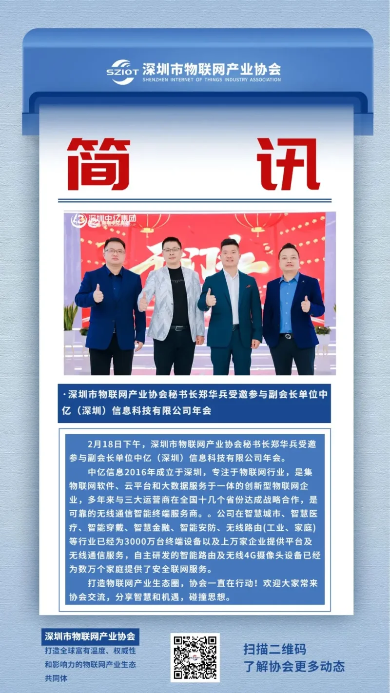 2月18日下午,深圳市物联网产业协会秘书长郑华兵受邀参与副会长单位中亿(深圳)信息科技有限公司年会。