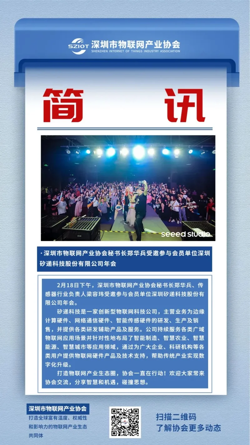 2月18日下午,深圳市物联网产业协会秘书长郑华兵、传感器行业负责人梁容玮受邀参与会员单位深圳矽递科技股份有限公司年会。