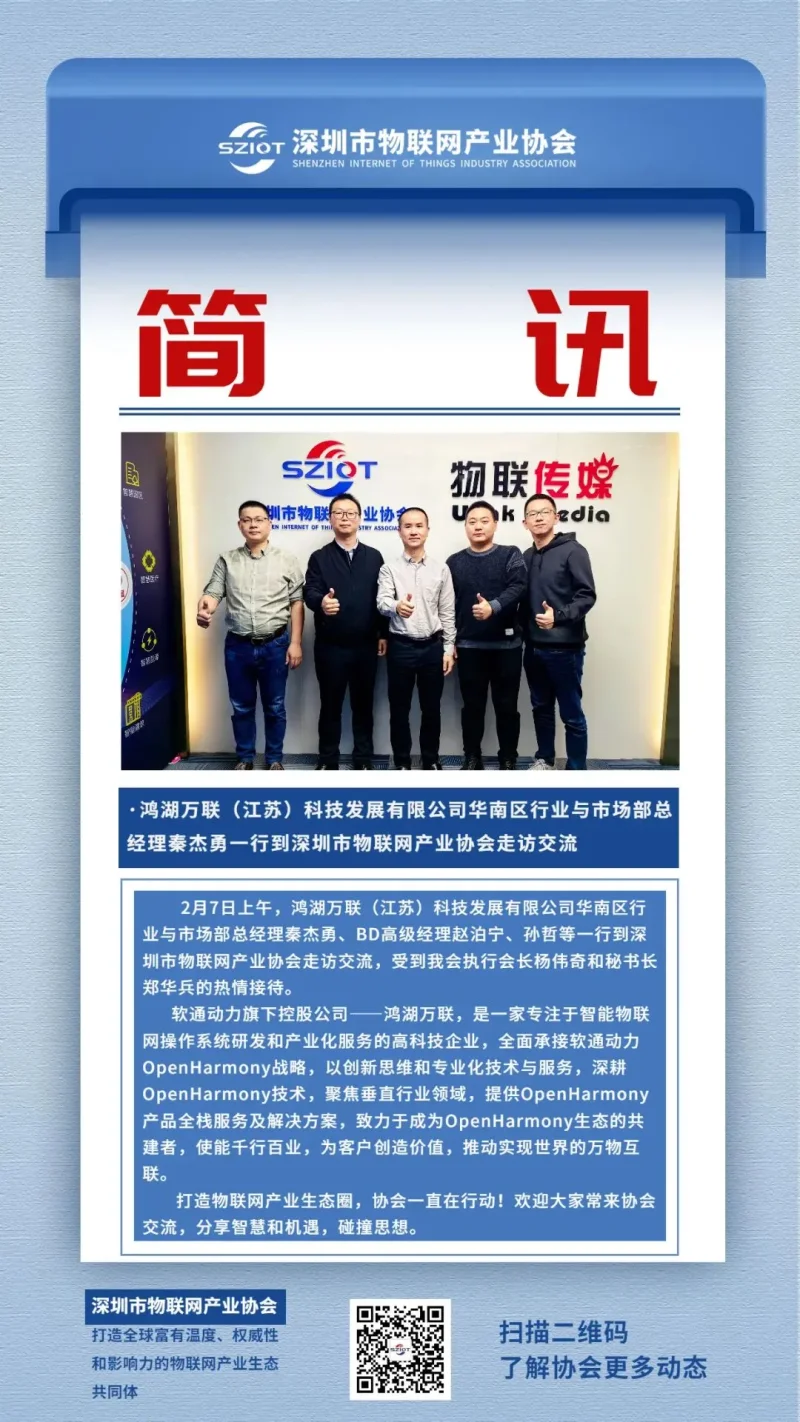 2月7日上午,鸿湖万联(江苏)科技发展有限公司华南区行业与市场部总经理秦杰勇一行到深圳市物联网产业协会走访交流。