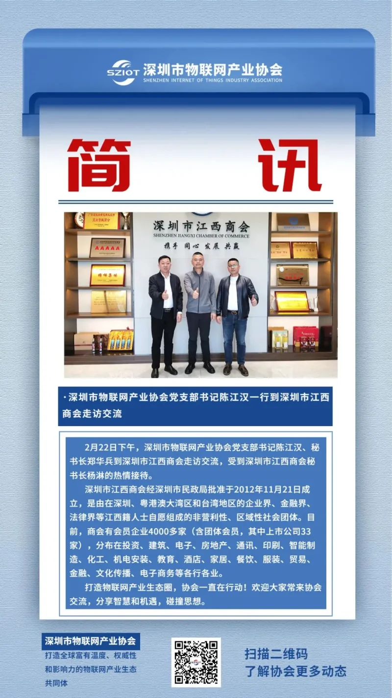 2月22日下午,深圳市物联网产业协会党支部书记陈江汉、秘书长郑华兵到深圳市江西商会走访交流,受到深圳市江西商会秘书长杨淋的热情接待。