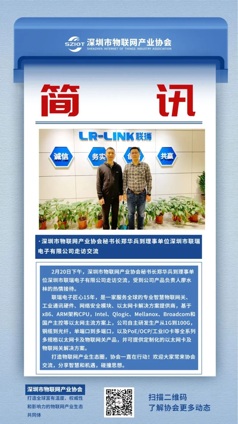 2月20日下午,深圳市物联网产业协会秘书长郑华兵到理事单位深圳市联瑞电子有限公司走访交流,受到公司产品负责人廖水林的热情接待。