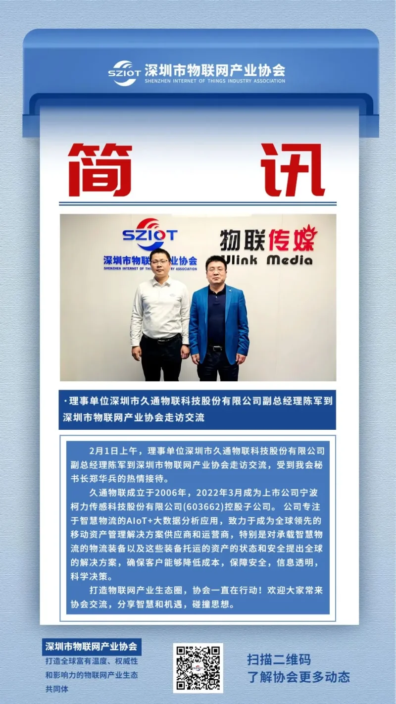 2月1日上午,理事单位深圳市久通物联科技股份有限公司副总经理陈军到深圳市物联网产业协会走访交流。