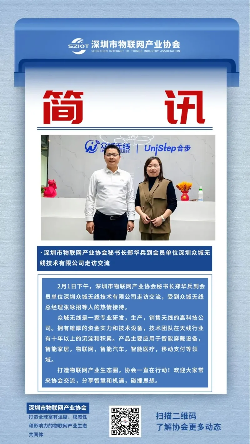 2月1日下午,深圳市物联网产业协会秘书长郑华兵到会员单位深圳众城无线技术有限公司走访交流,受到众城无线总经理张咏招等人的热情接待。